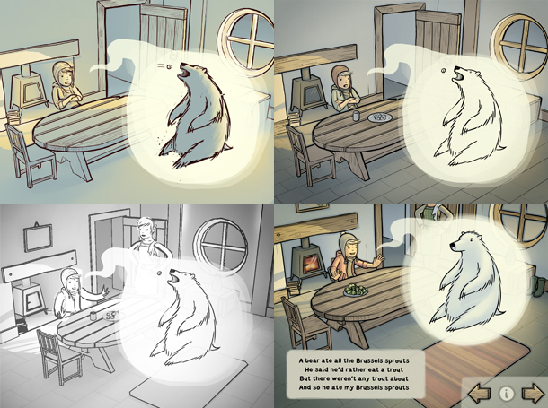I was approached by writer & producer Charles Kriel with a tantalisingly simple brief – to illustrate and animate an interactive children’s book for the iPad entitled ‘A Bear Ate All The Brussels Sprouts’. If I wasn’t already sold on the prospects of working on the iPad, then Charles’ succinctly charming story about a boy and his overactive imagination (let’s just say it wasn’t difficult for me to identify with the lead protagonist) as well as the freedom to take the artwork in my own direction was just too great an opportunity to miss.